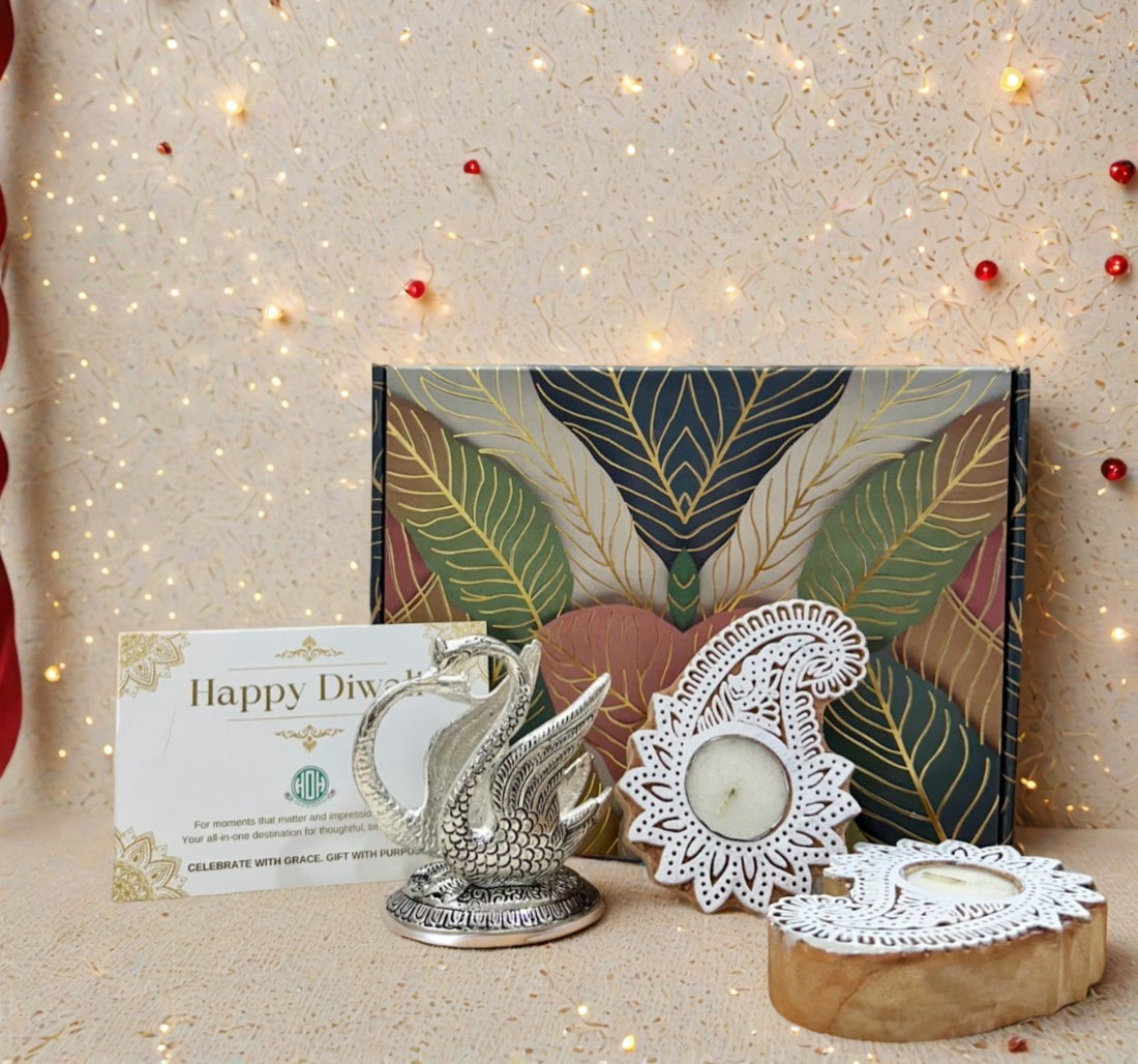Diwali Gift Box – Swan Tissue Holder & Wooden Diya Combo