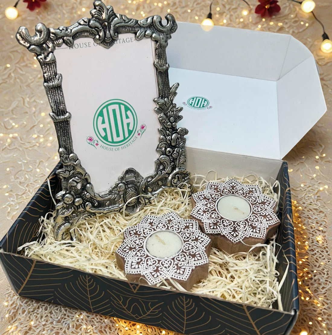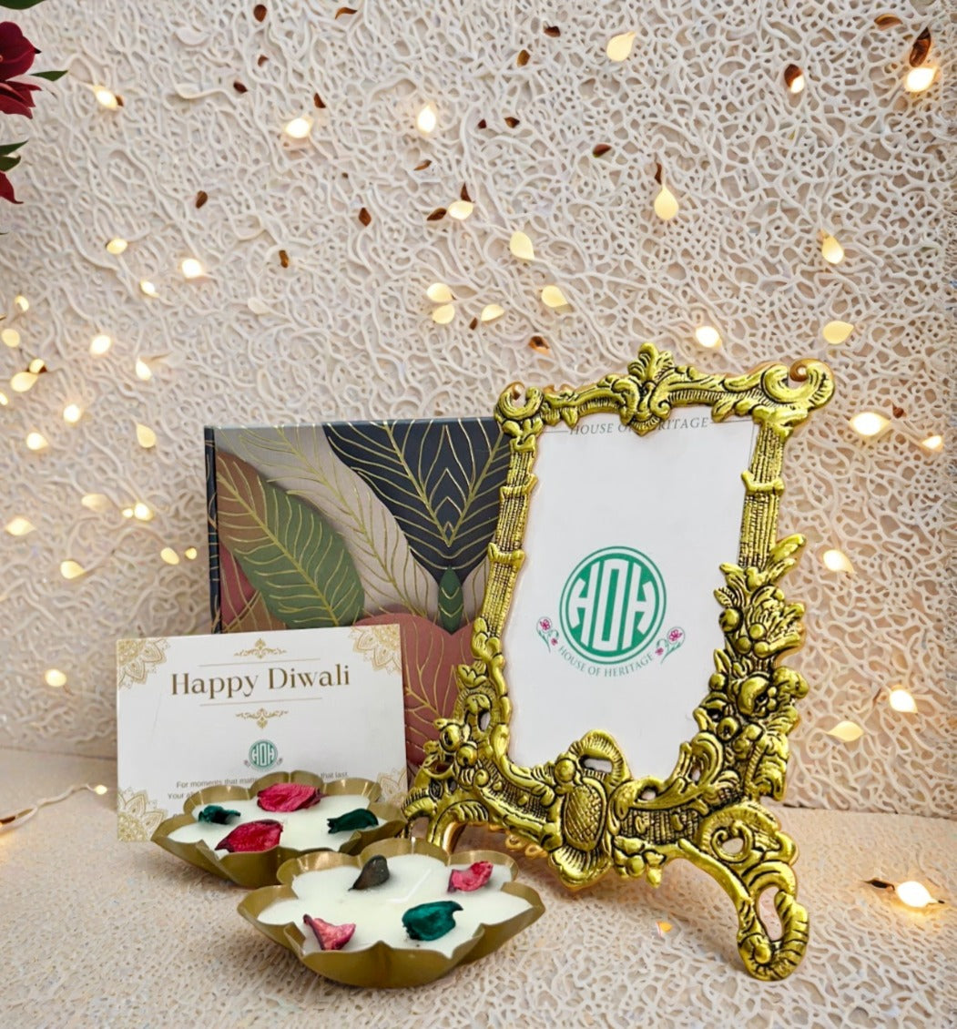 Diwali Gift Box – Photo Frame & Metal Wax Diya Combo