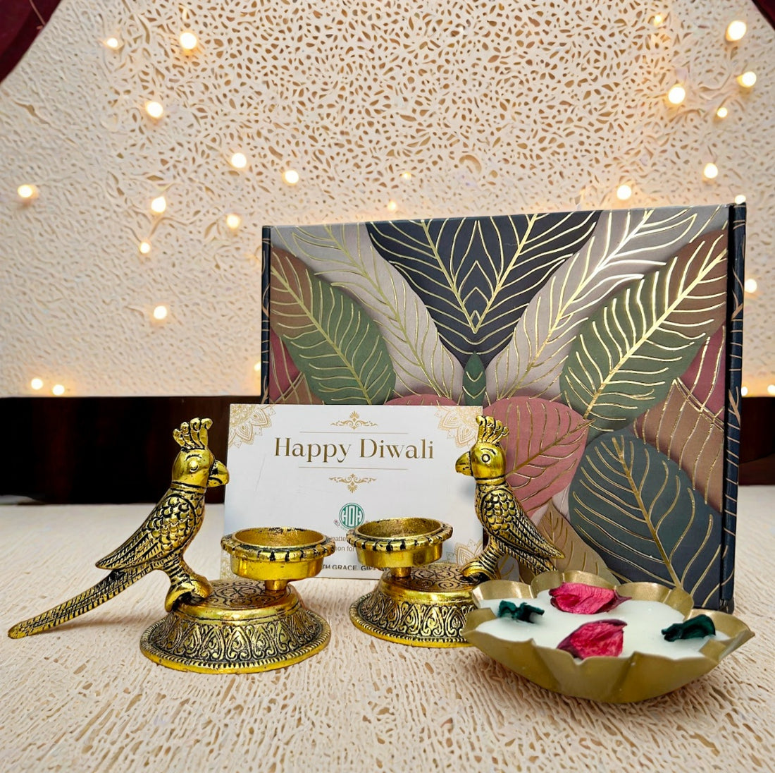 Diwali Gift Box – Parrot T-Light & Metal Wax Diya Combo