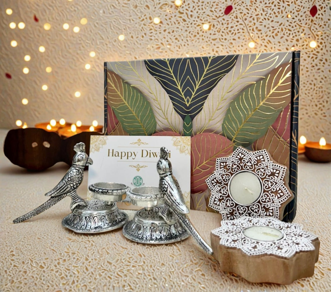 Diwali Gift Box – Parrot T-Light & Wooden Diya Combo