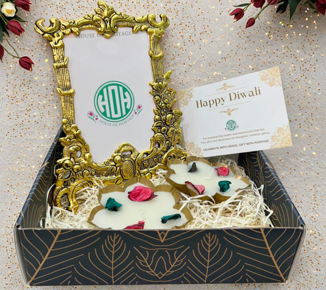Diwali Gift Box – Photo Frame & Metal Wax Diya Combo