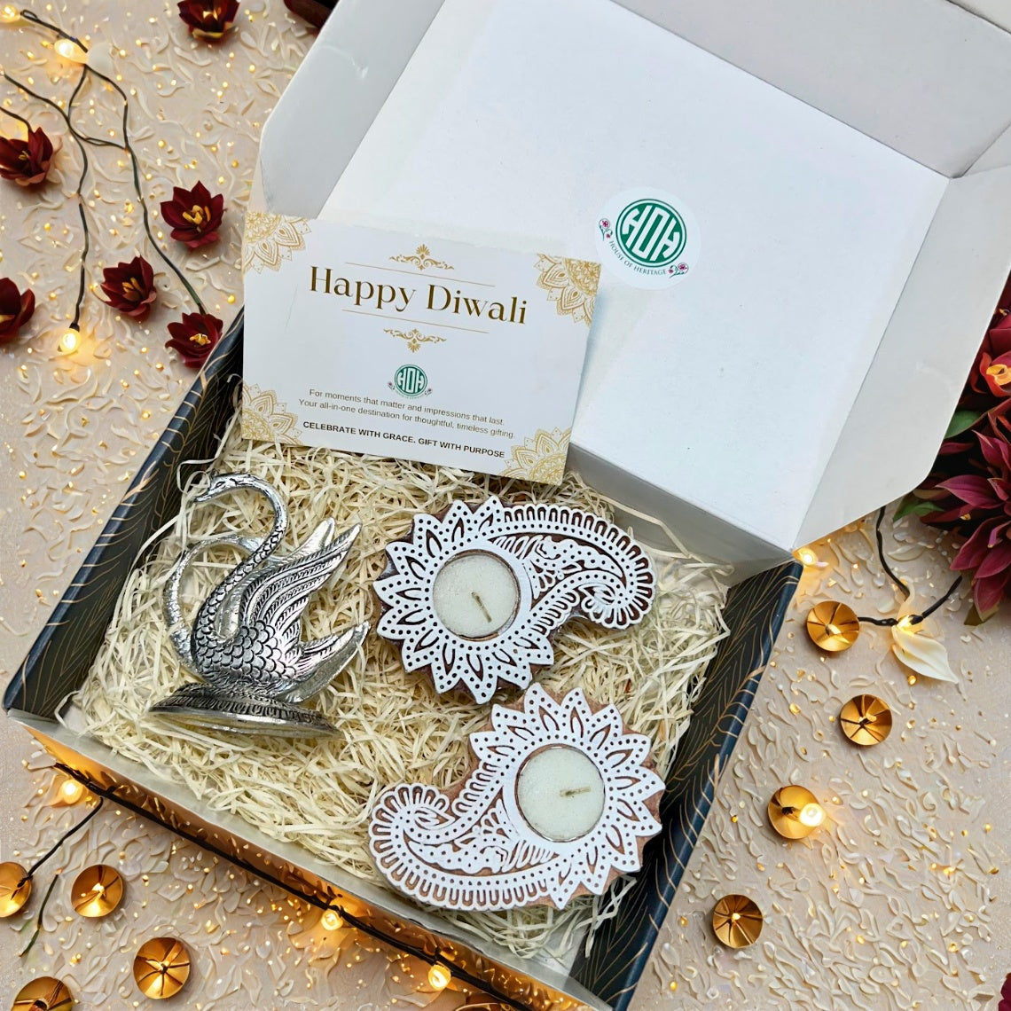 Diwali Gift Box – Swan Tissue Holder & Wooden Diya Combo