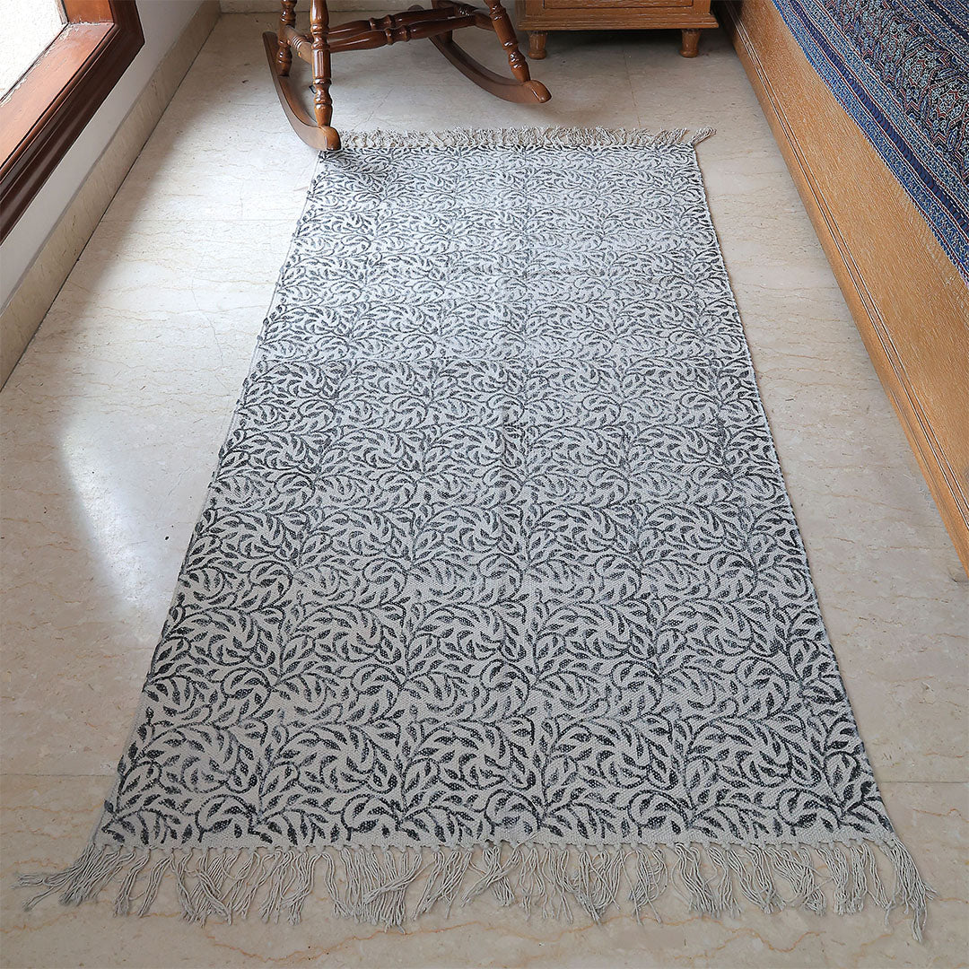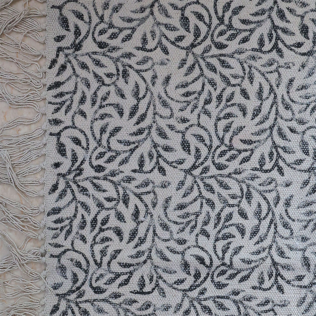 Monochrome Leaf Handwoven Cotton Rug – Black & Ivory with Fringe