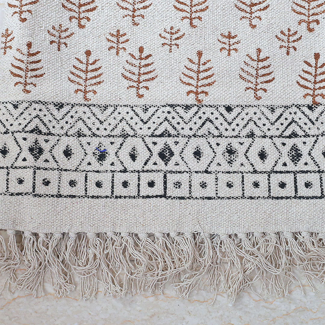 Bring home earthy elegance with our Tribal Earth Handwoven Rug, featuring rustic brown leaf block prints and bold black tribal borders on a natural cotton base. Finished with fringe detailing, it's perfect for neutral-toned, boho, or rustic-inspired interiors.